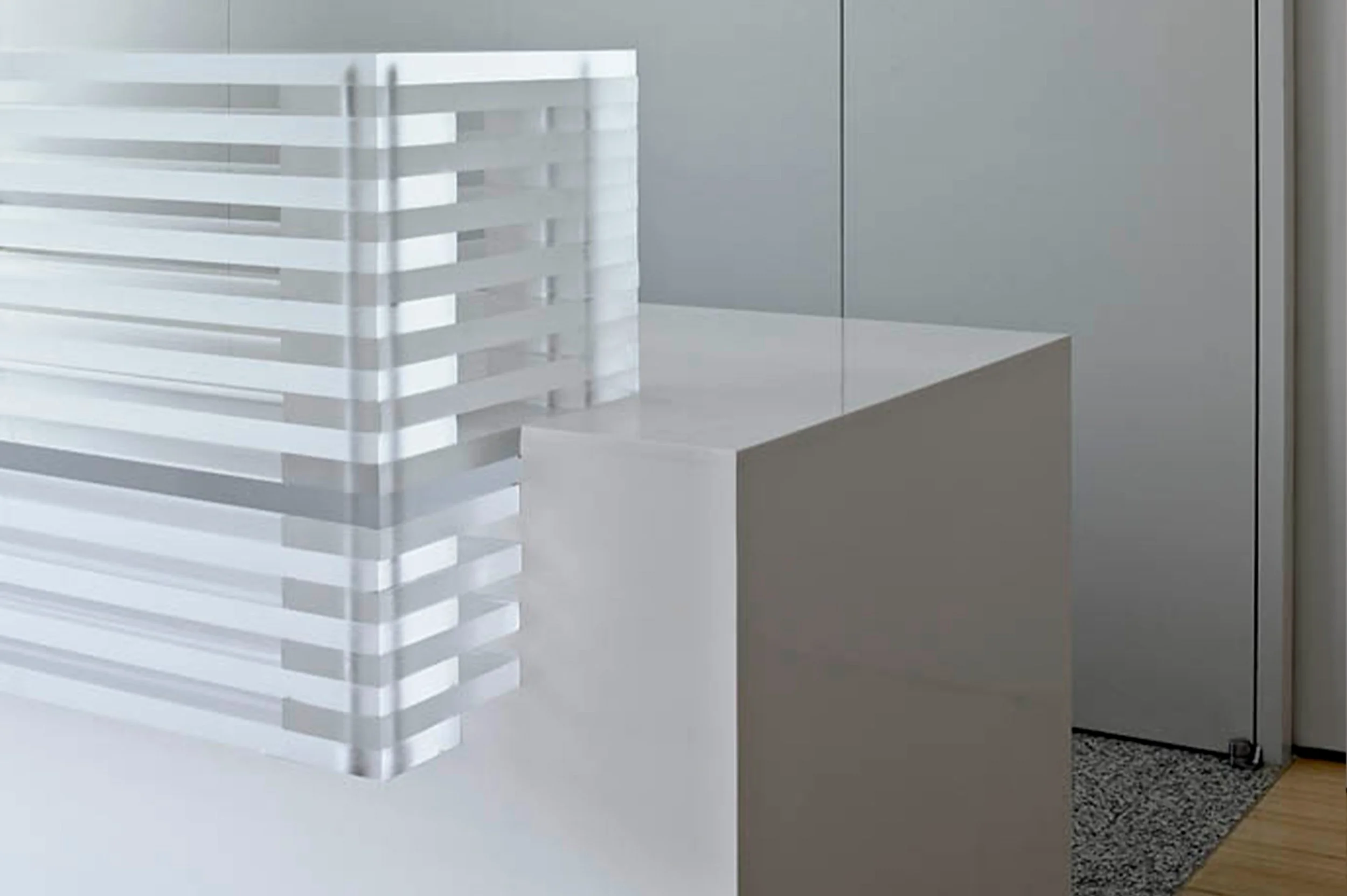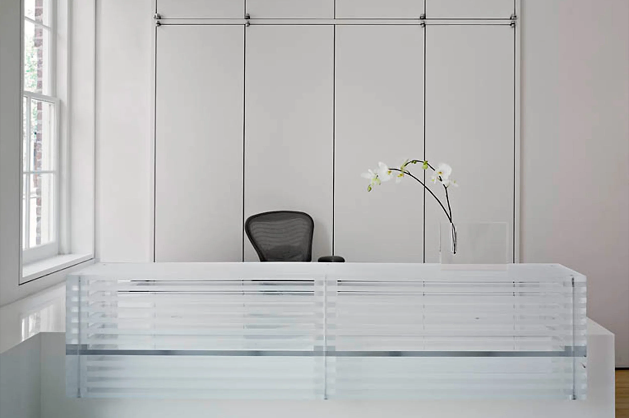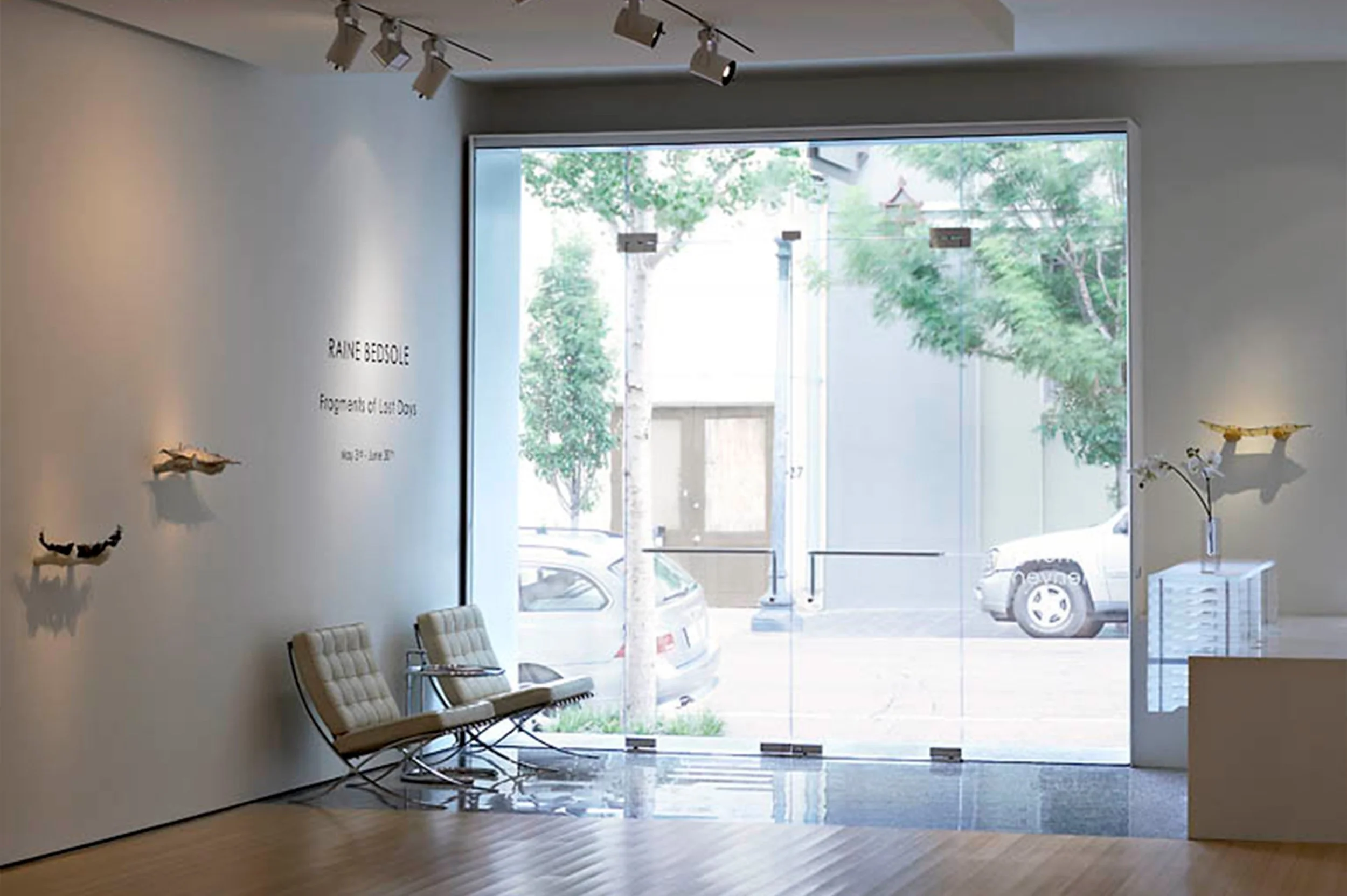 A 2,500-square-foot art gallery was completely renovated to create a spacious, loft-like environment suitable for large-scale paintings, sculptures, and multimedia installations. The redesign replaced the original Victorian-style entry with modern steel and glass doors, reconfigured the interiors for greater openness, and introduced a striking acrylic reception counter that emphasizes natural light at the gallery’s entrance.