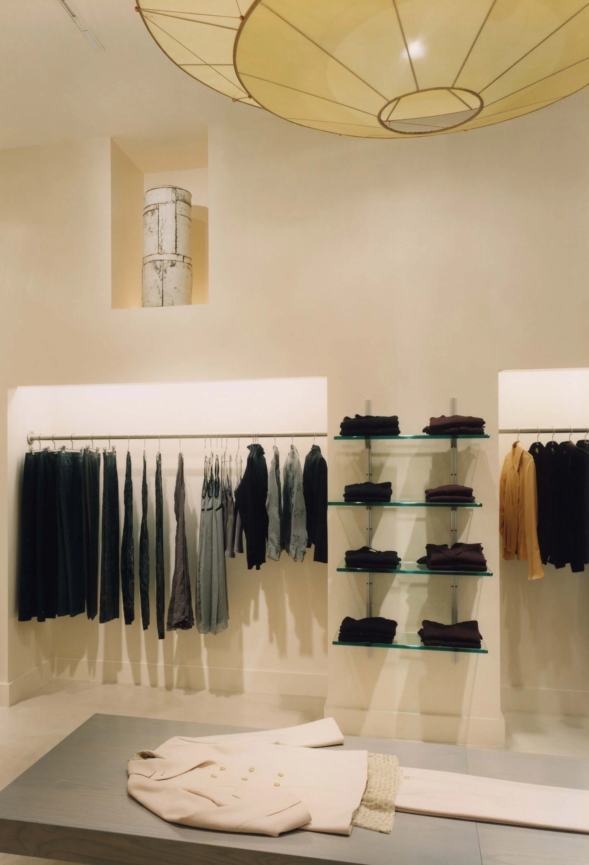 “Tackling the task in order of priorities, (Ledbetter) first went about visually blending the complexion of walls, ceiling and floor. To transform the mismatched planes into an interflowing volume, he applied white-pigmented plaster stained with tea-toned acid overhead and to all side walls, repeating a similar tonality in seamless concrete underfoot. Within this cocoon of oneness, fashions and fixturing seem to float. Ledbetter, who finds ‘a cool minimalism’ a bit chilling, opts for a design approach that comes across as warm.”