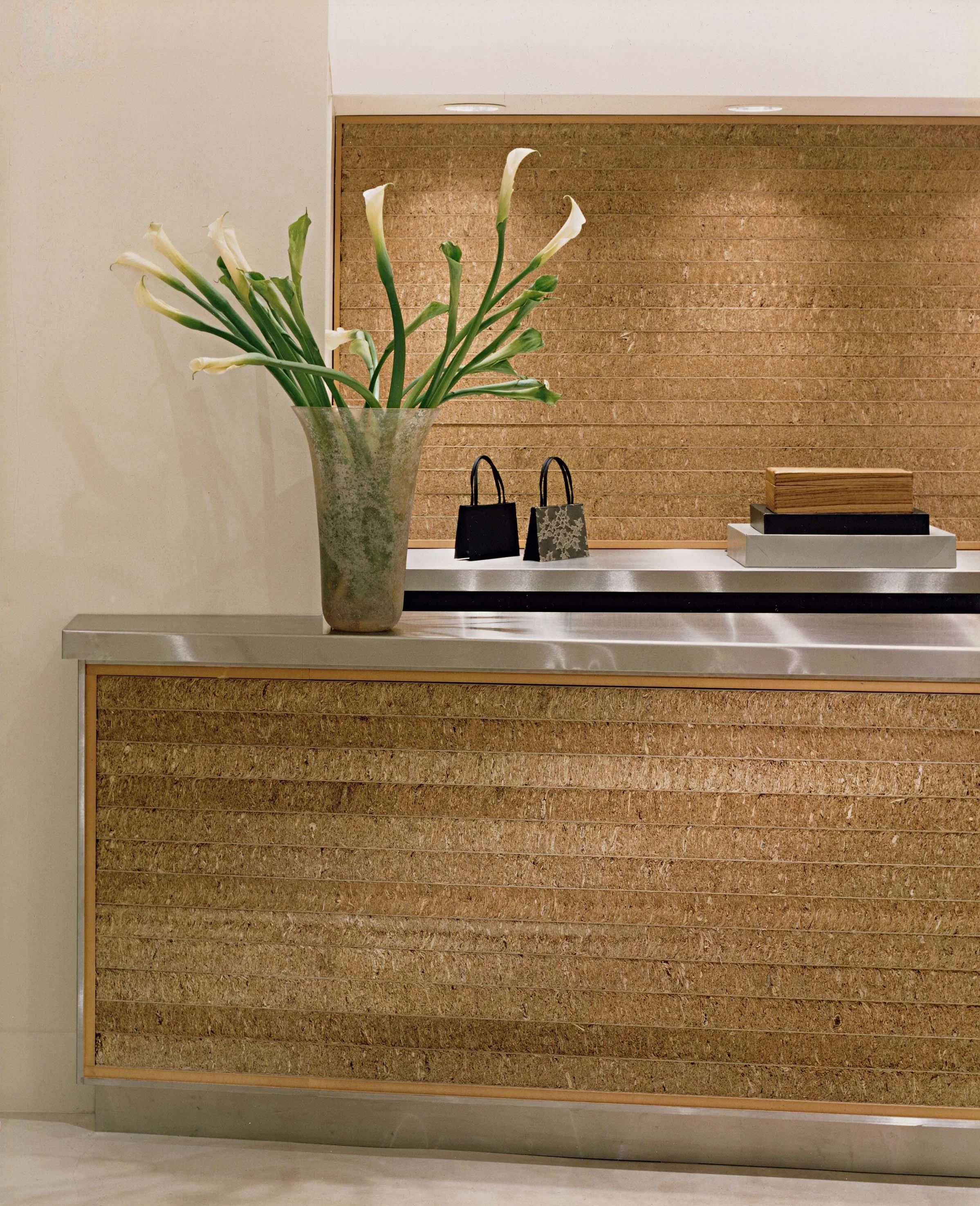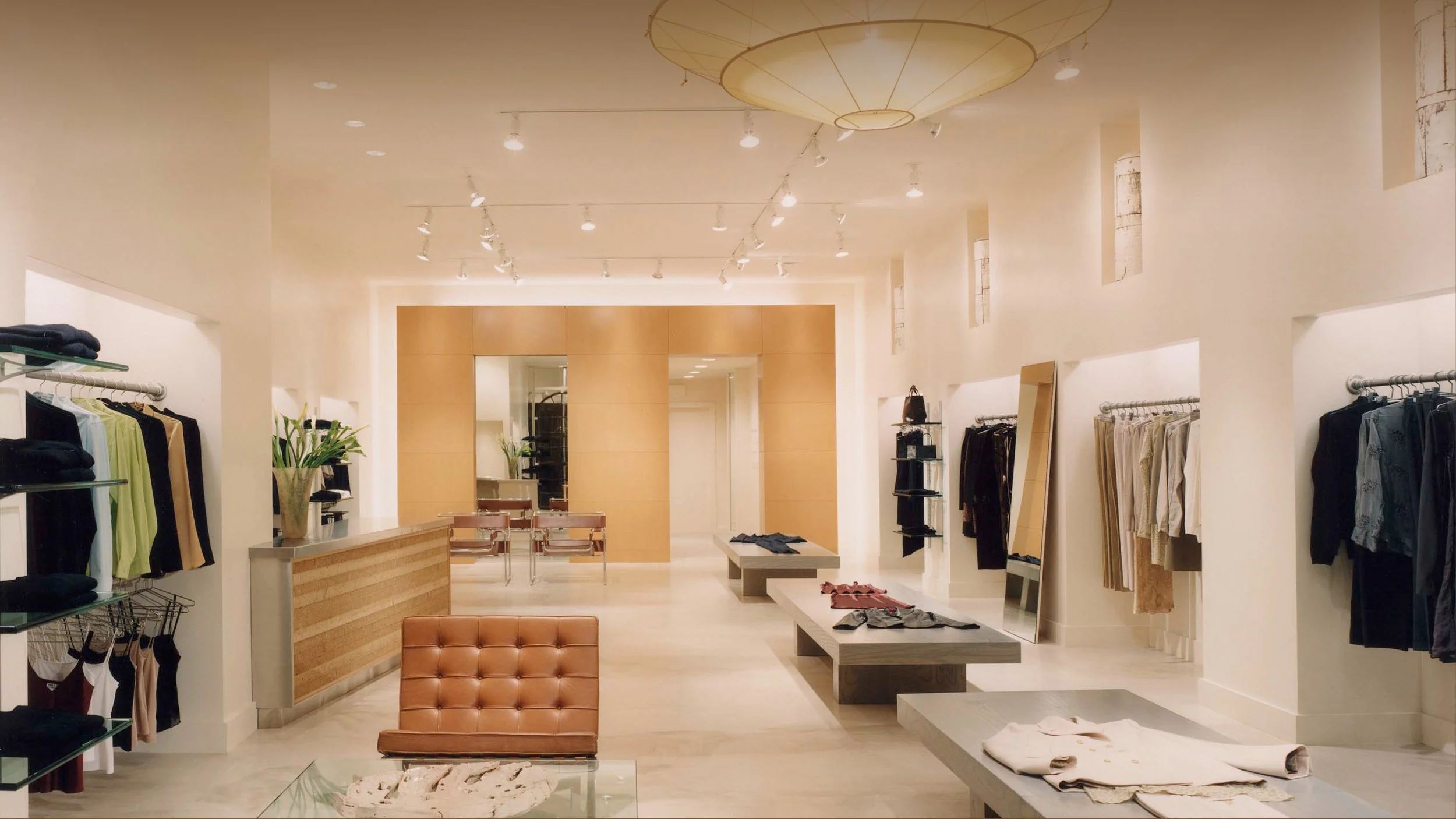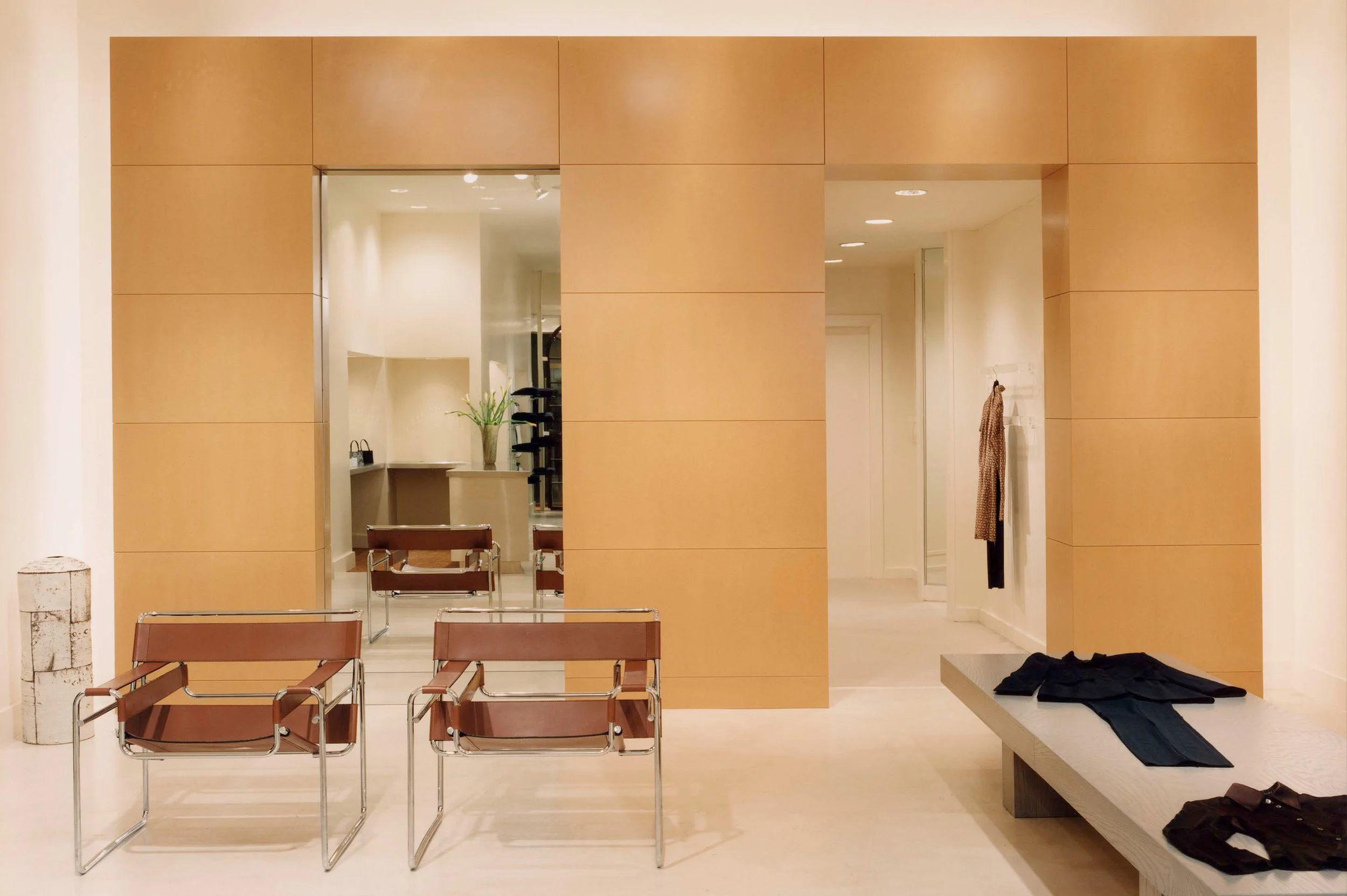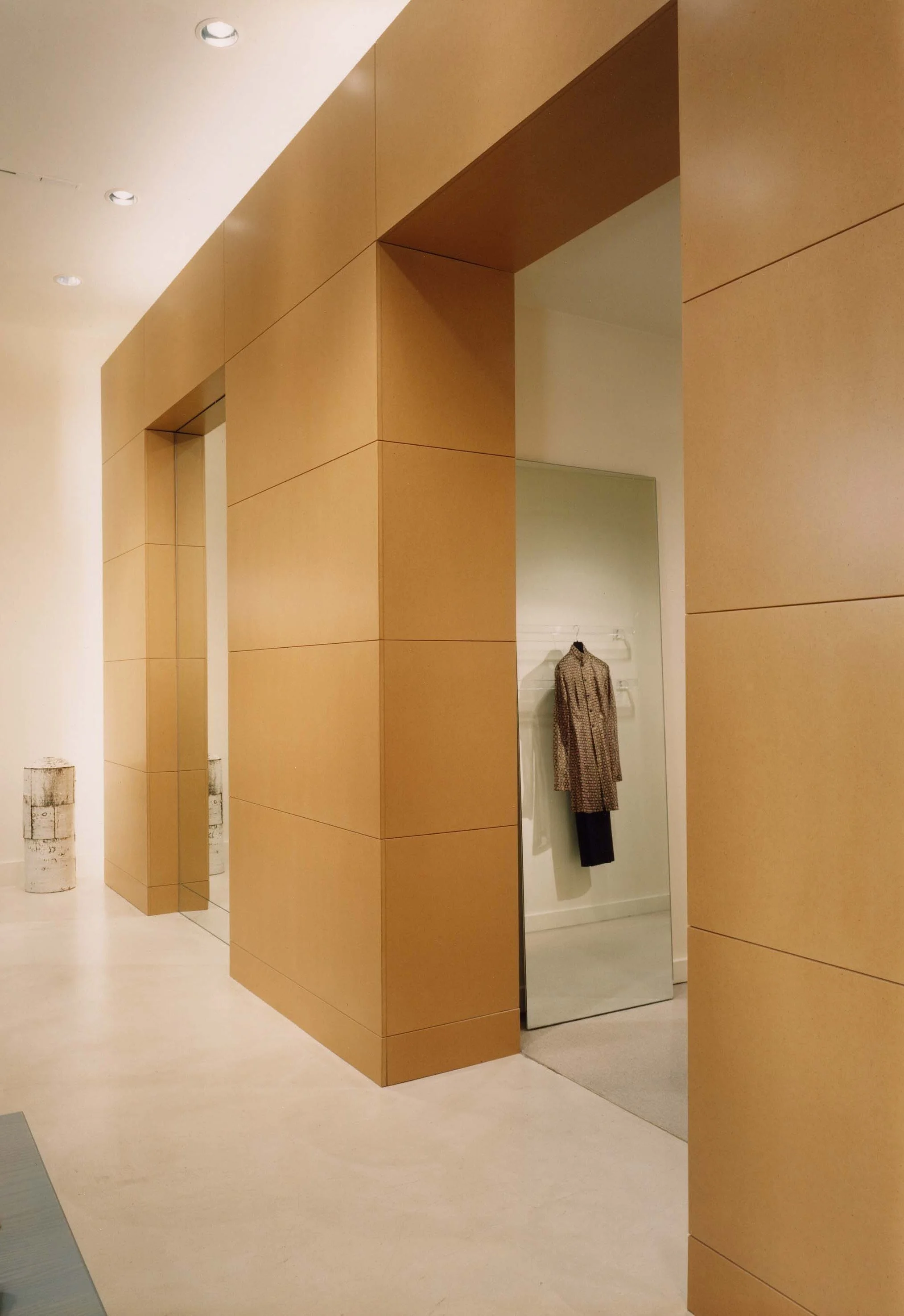 This 1,500-square-foot boutique uses a minimalist material palette to create a serene, gallery-like setting for displaying clothing alongside Asian-inspired ceramic vessels by New York artist Peter Lane. Seamless surfaces, floating visual effects, and custom ash veneer display tables direct attention to a dramatic freestanding feature wall of lacquered fiberboard and mirror.
