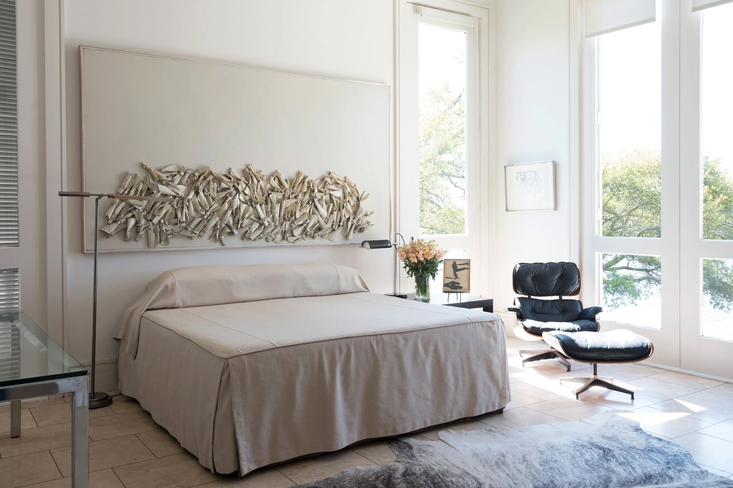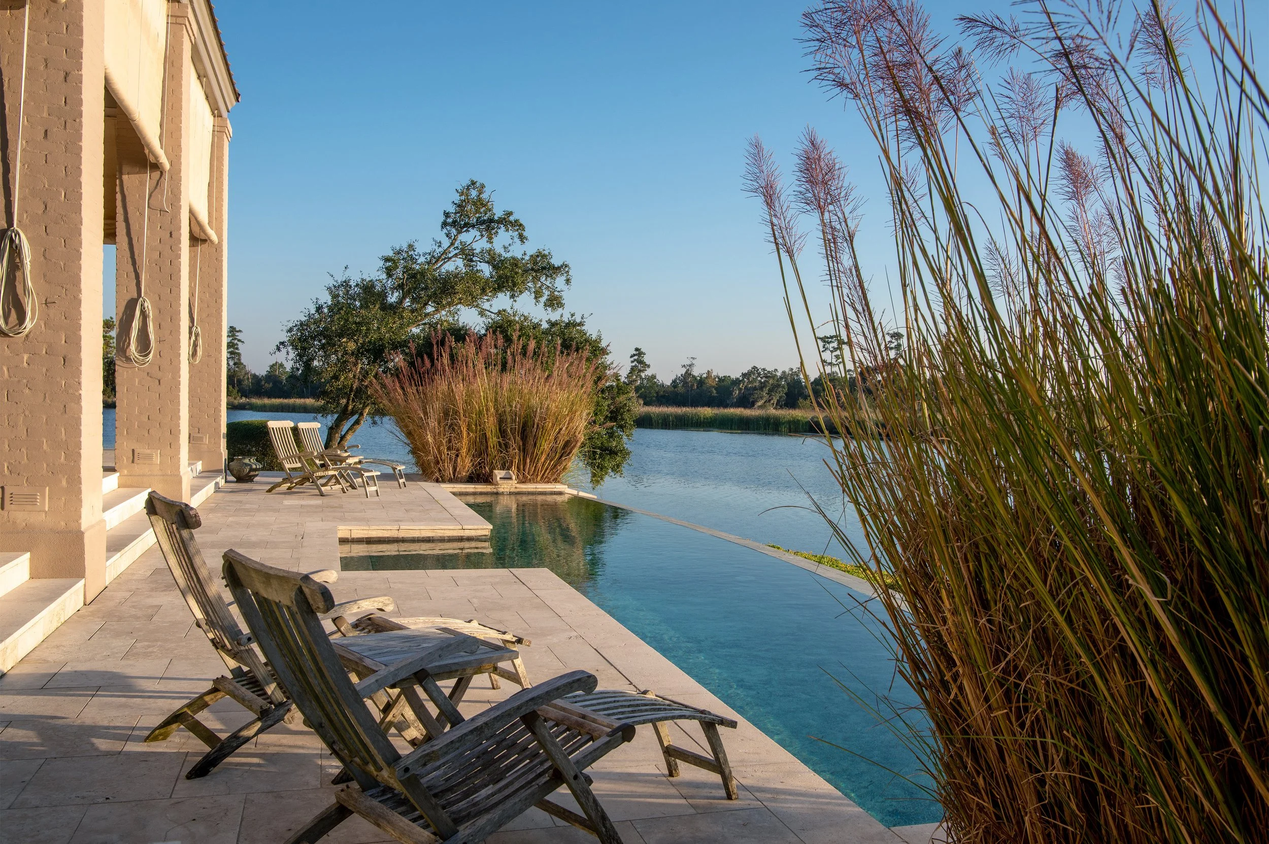 Designed for an artist, this 2,500-square-foot residence offers a modern reinterpretation of southern Louisiana’s vernacular architecture. Set on a peninsula with expansive views of the bayou, marshlands, and abundant wildlife, the tall one-story home blends steep-roofed Creole influences with minimalist materials and broad glass walls. The result is a design that maximizes natural light, openness, and connection to the surrounding landscape, enhanced by an artesian pond, lap pool, and carefully curated furnishings.