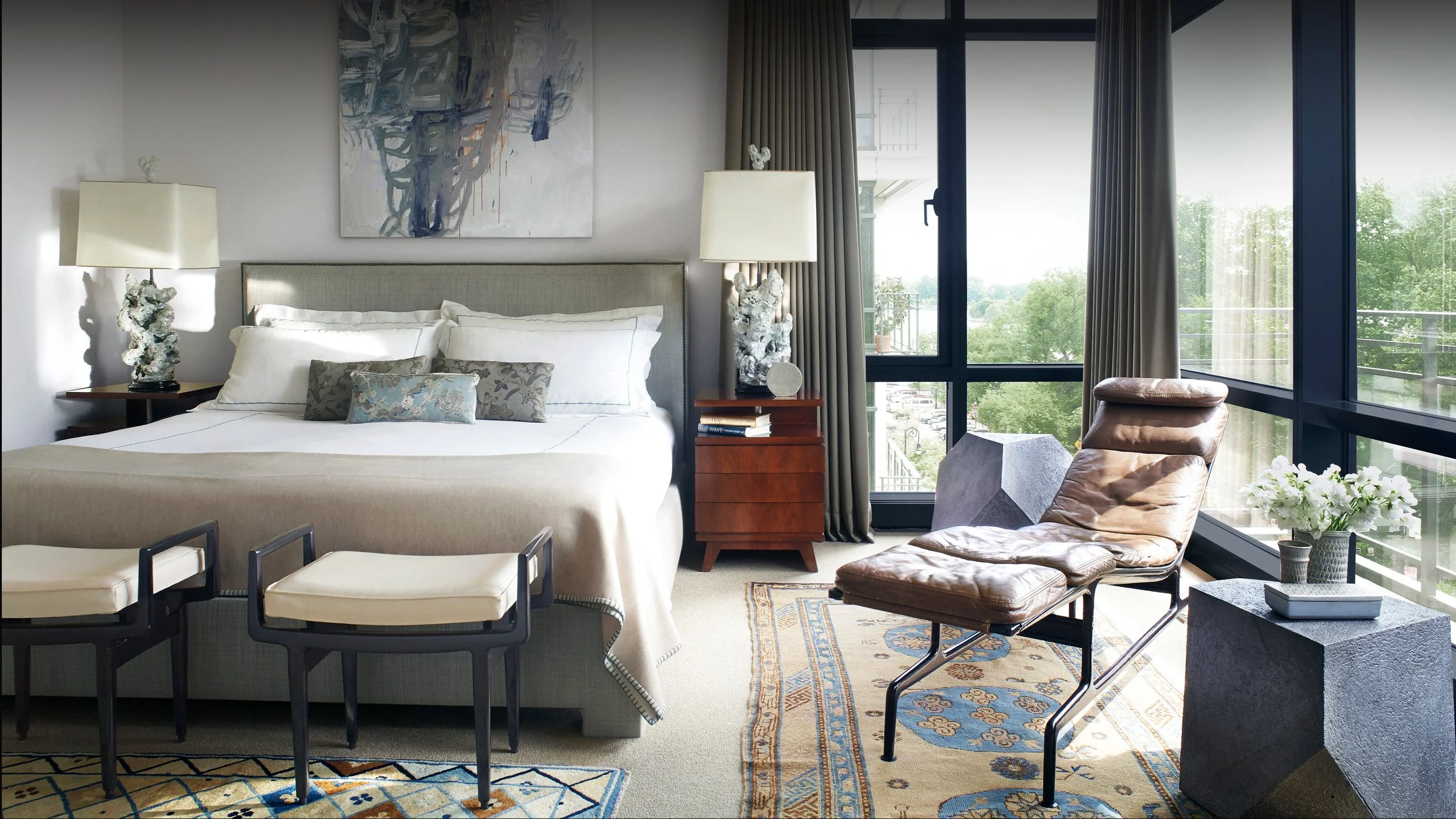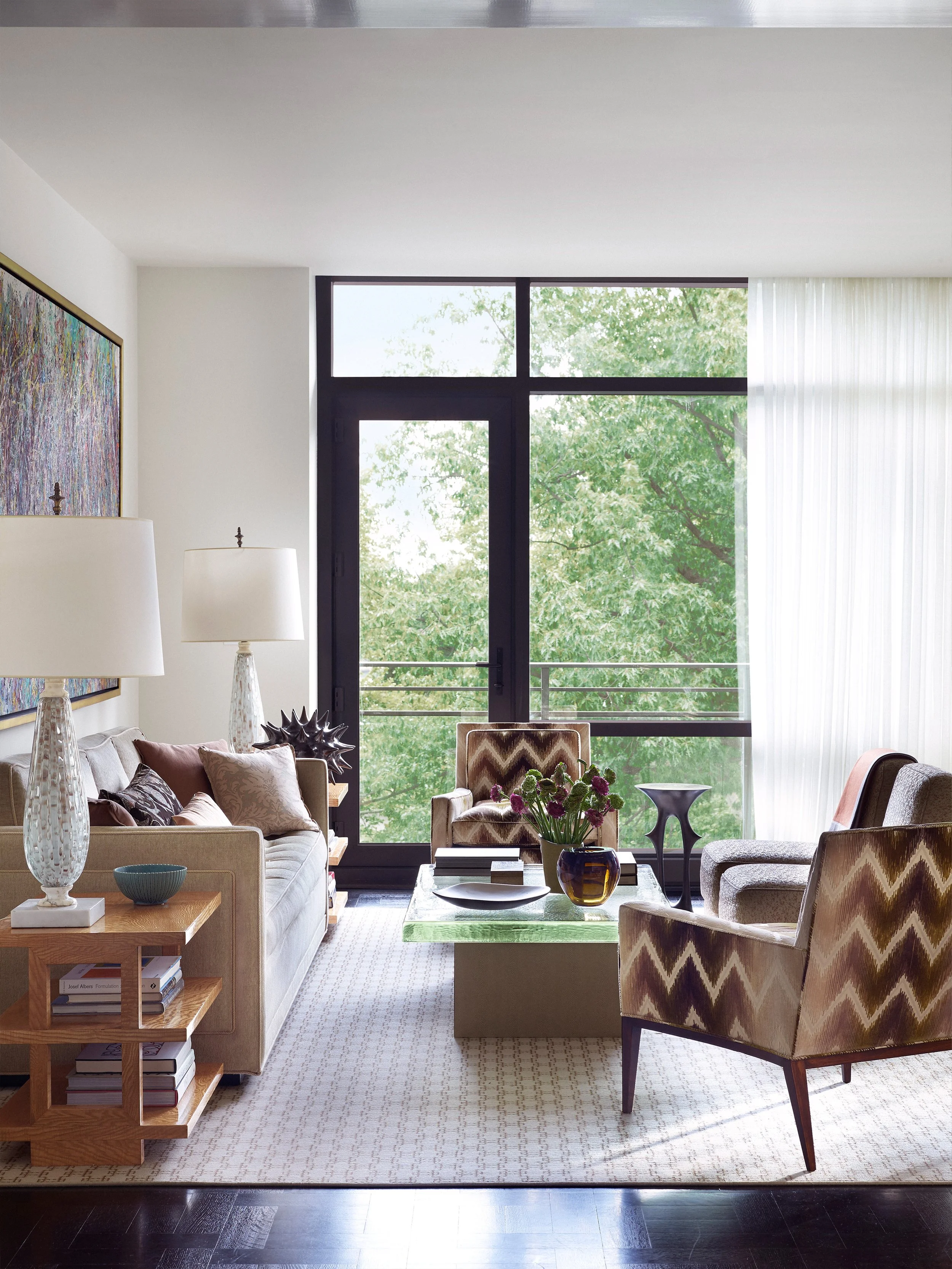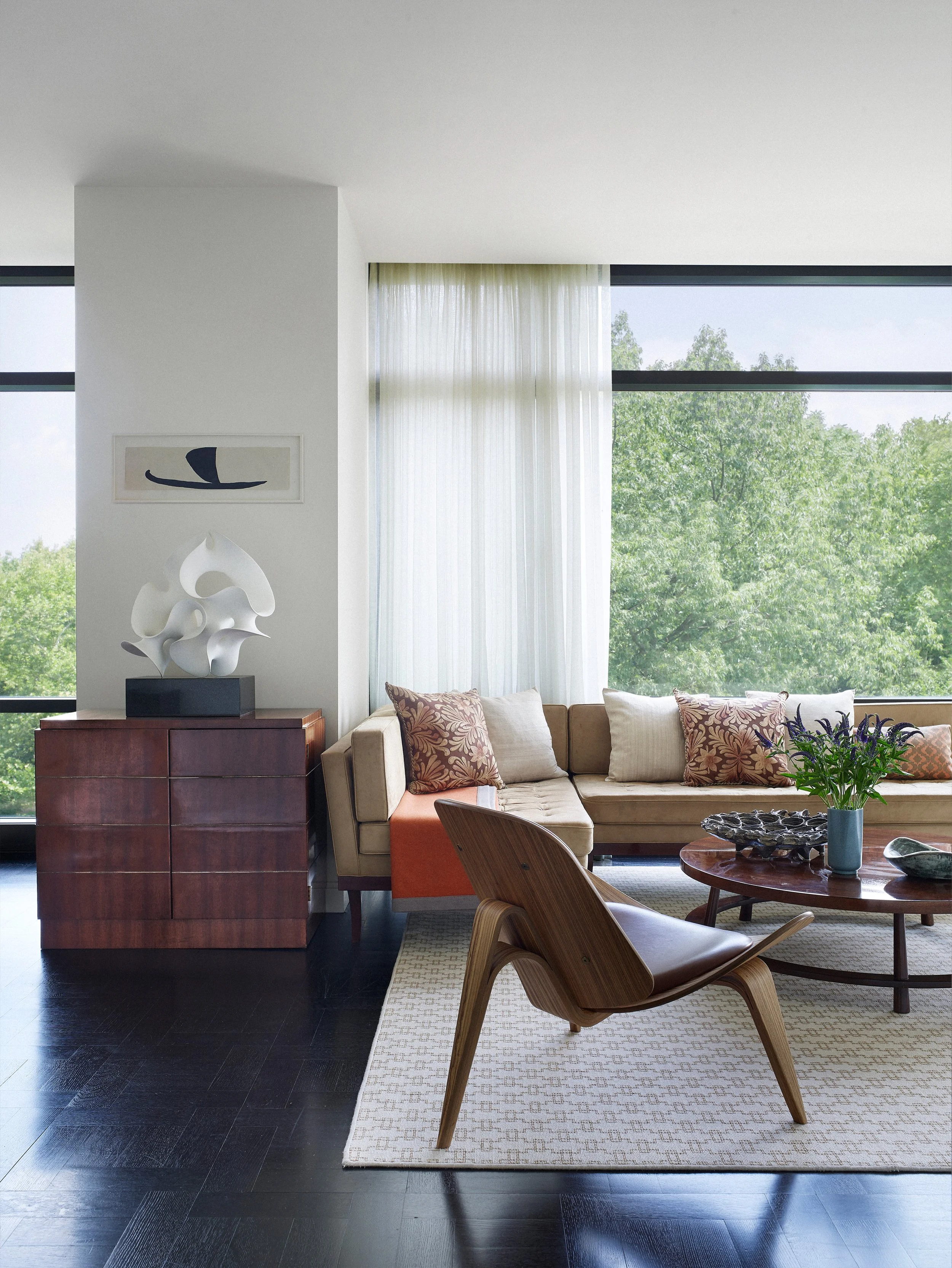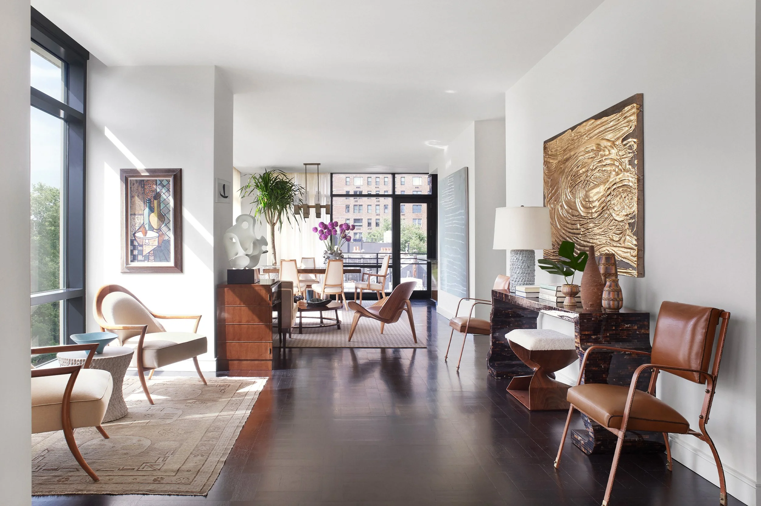 Two Upper East Side apartments were merged into a 3,500-square-foot residence that maximizes views of the park and river while consolidating structural and mechanical systems into a central service core. The interior blends a gallery-like modern aesthetic with mid-century furnishings, Italian antiques, and contemporary art, resulting in a cohesive and sophisticated living environment.
