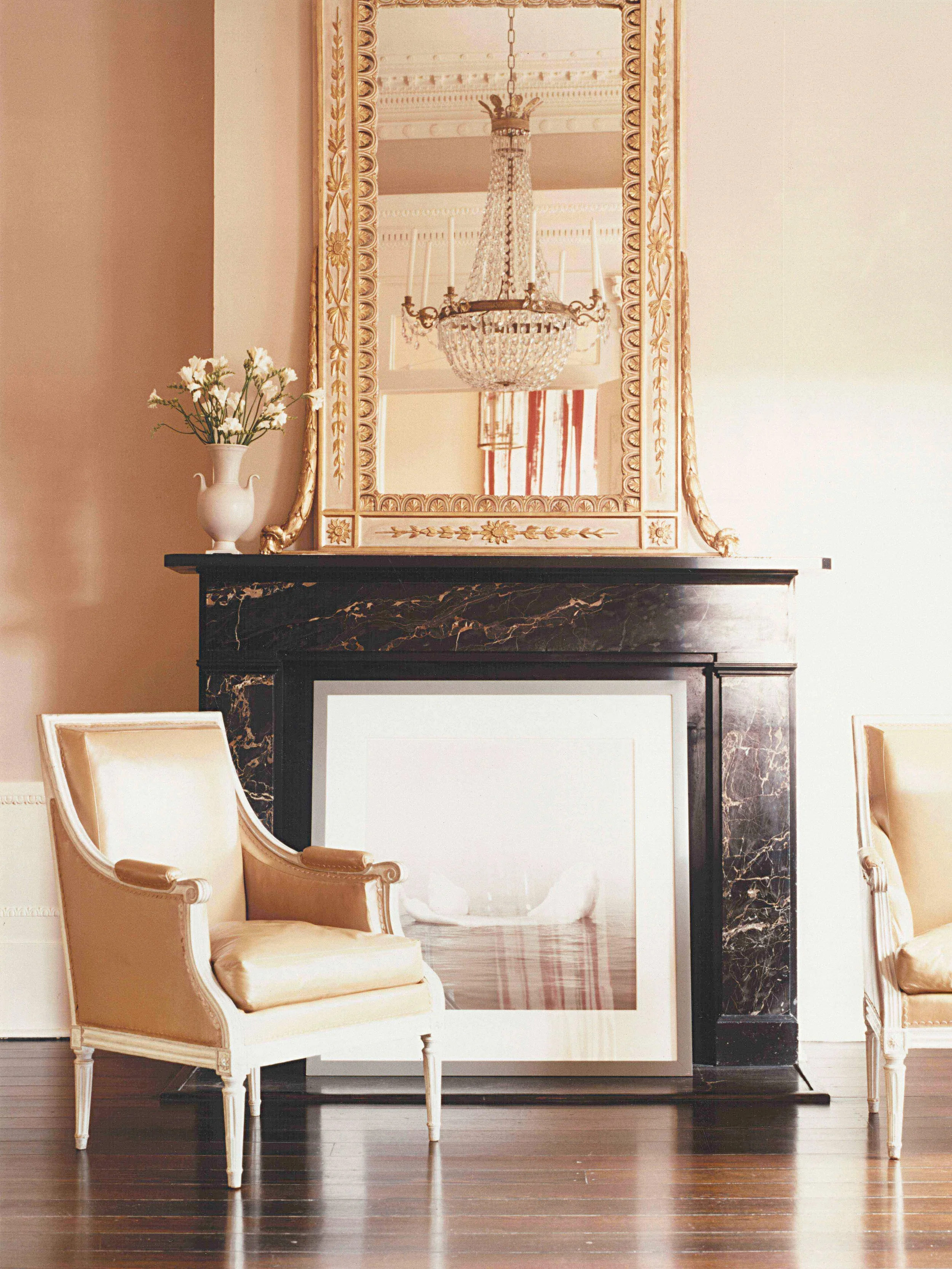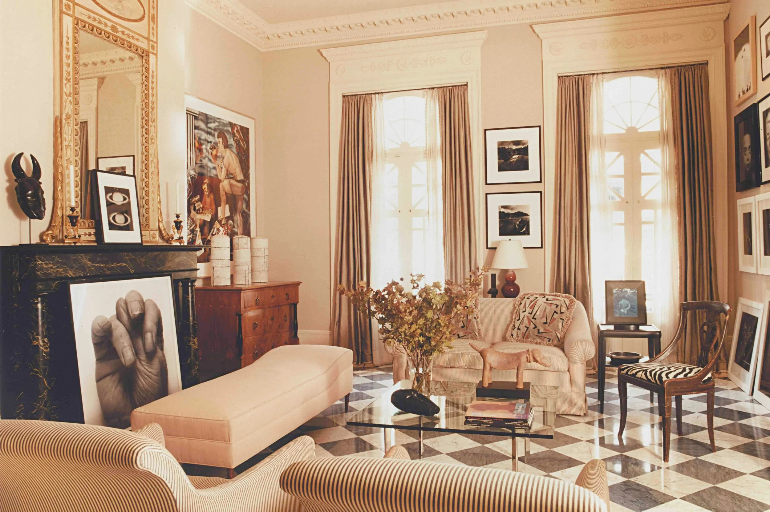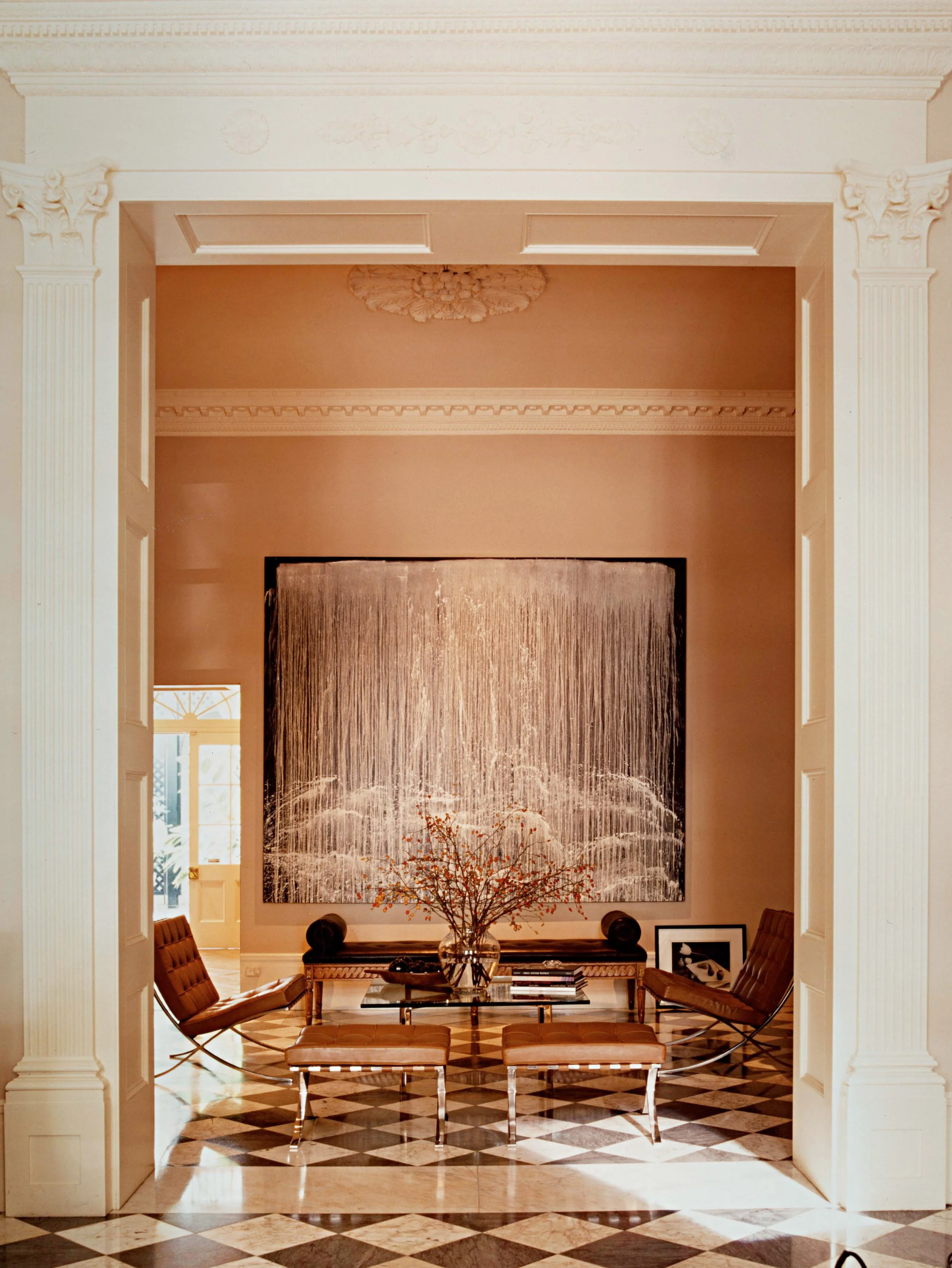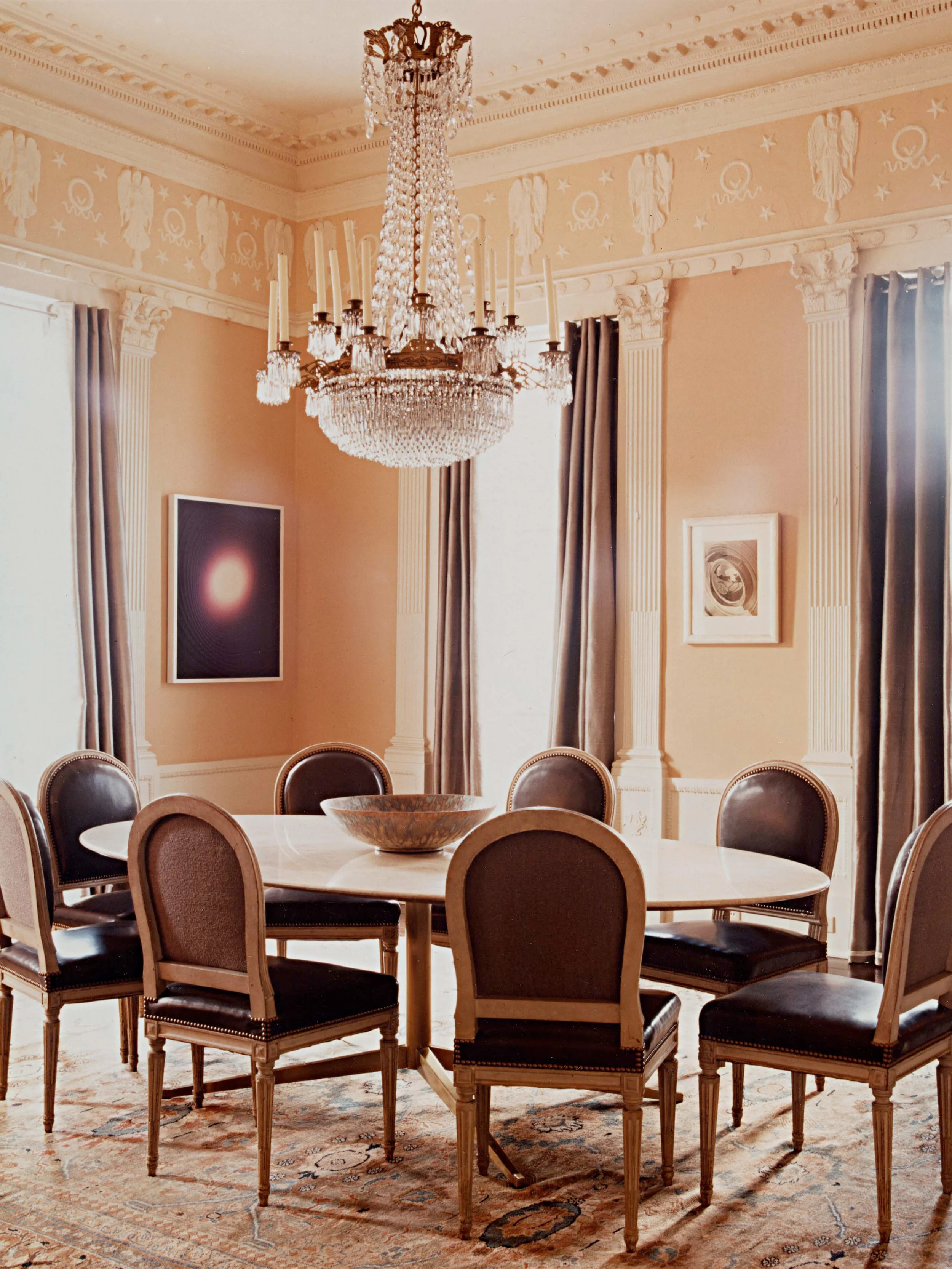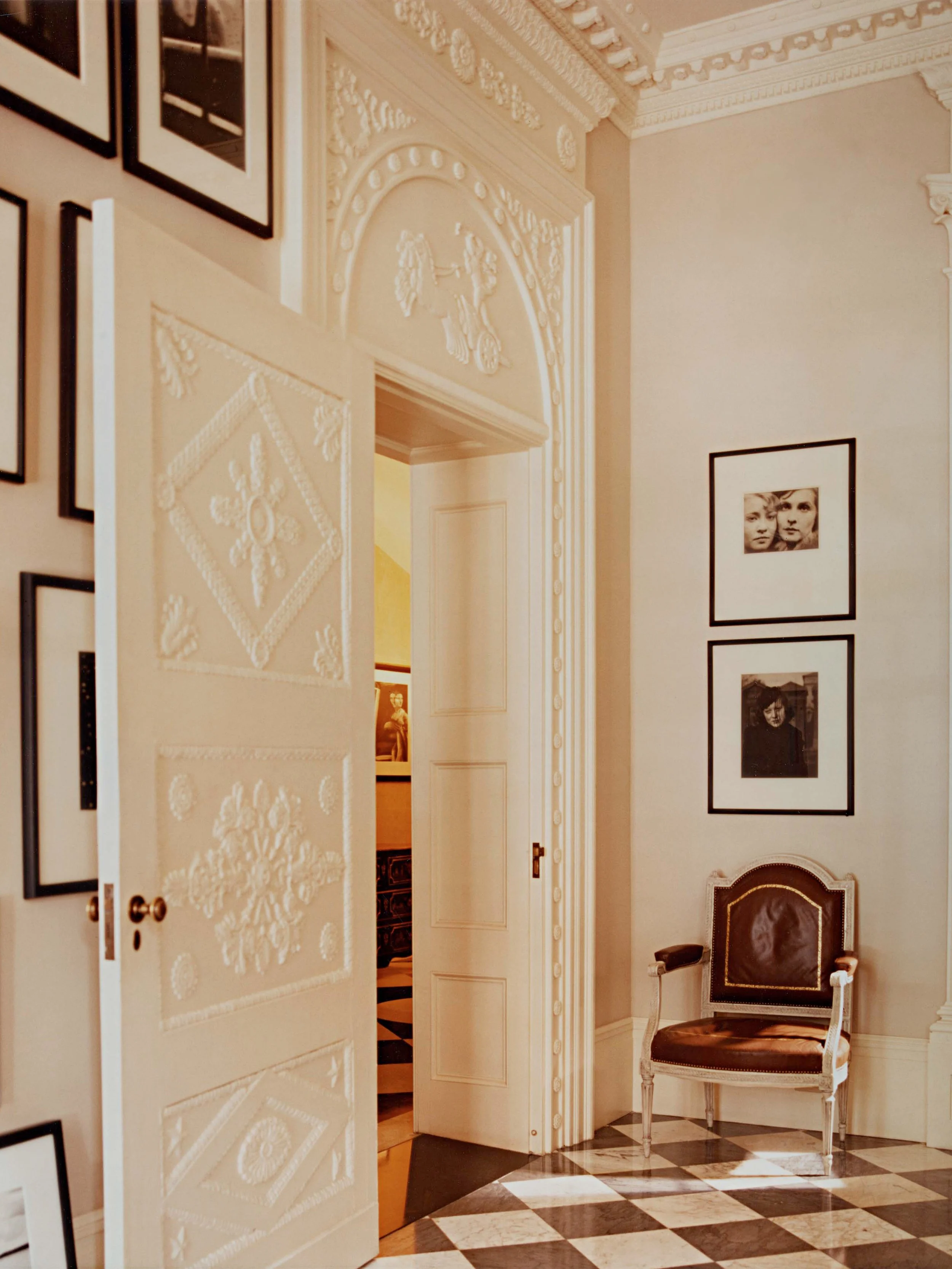 The interiors of this 1828 French Empire mansion were designed to complement its elaborate neoclassical millwork while showcasing the owner’s collection of contemporary art and photography. Eclectic furnishings—from Louis XVI to mid-20th-century modern—are set against a neutral palette, creating a refined backdrop that highlights the artwork while preserving the home’s historic character.