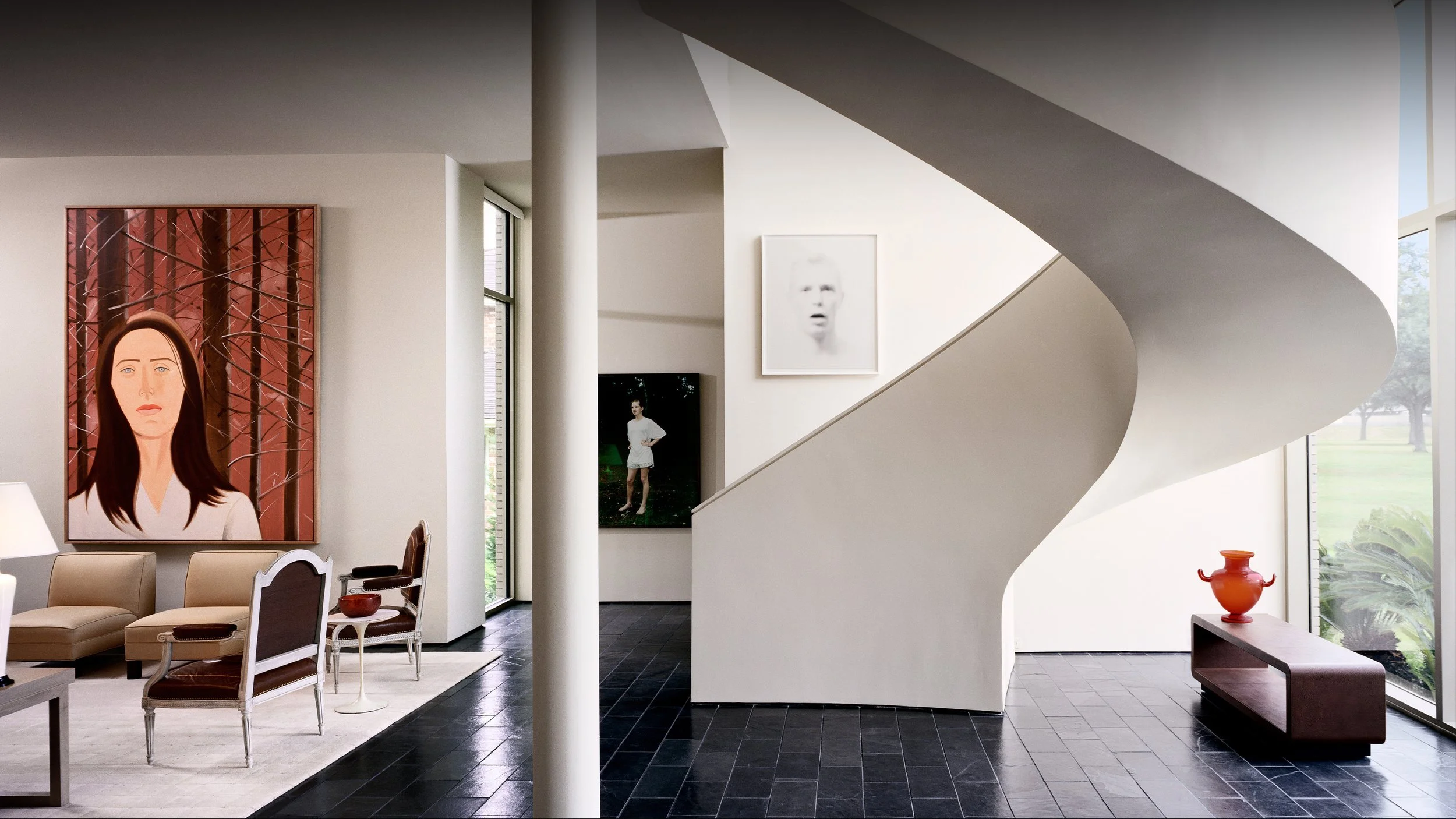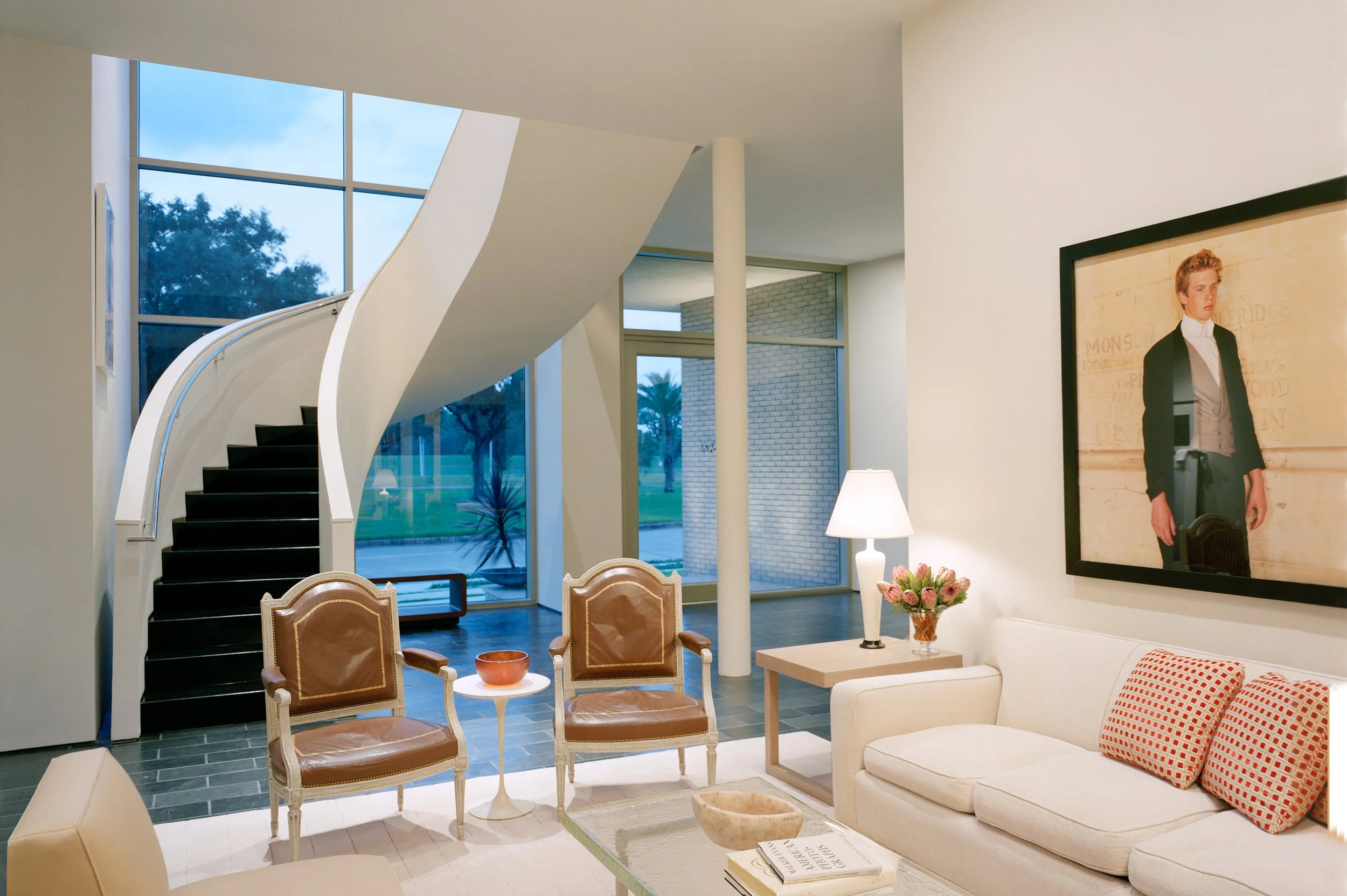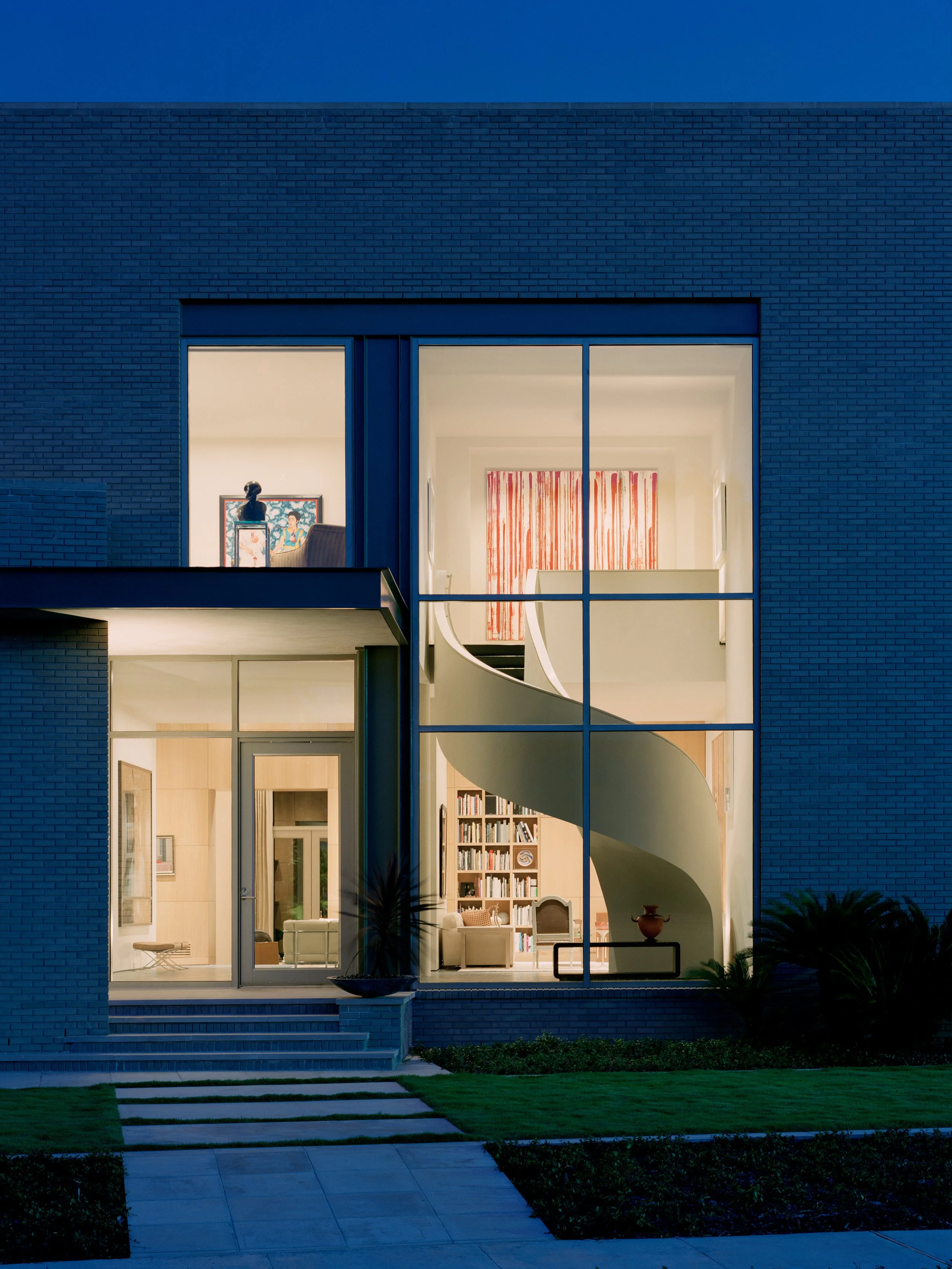 This minimalist silver-gray brick residence was designed to showcase a significant collection of contemporary paintings and photography while shielding them from excessive natural light. Inside, architectural features such as a serpentine staircase, arched ceiling, and warm oak spine soften the home’s rectilinear form, creating an inviting contrast to the cool white plaster walls and black slate floors. The interior design merges historical and modern furnishings, resulting in a home that celebrates both its art collection and everyday living.