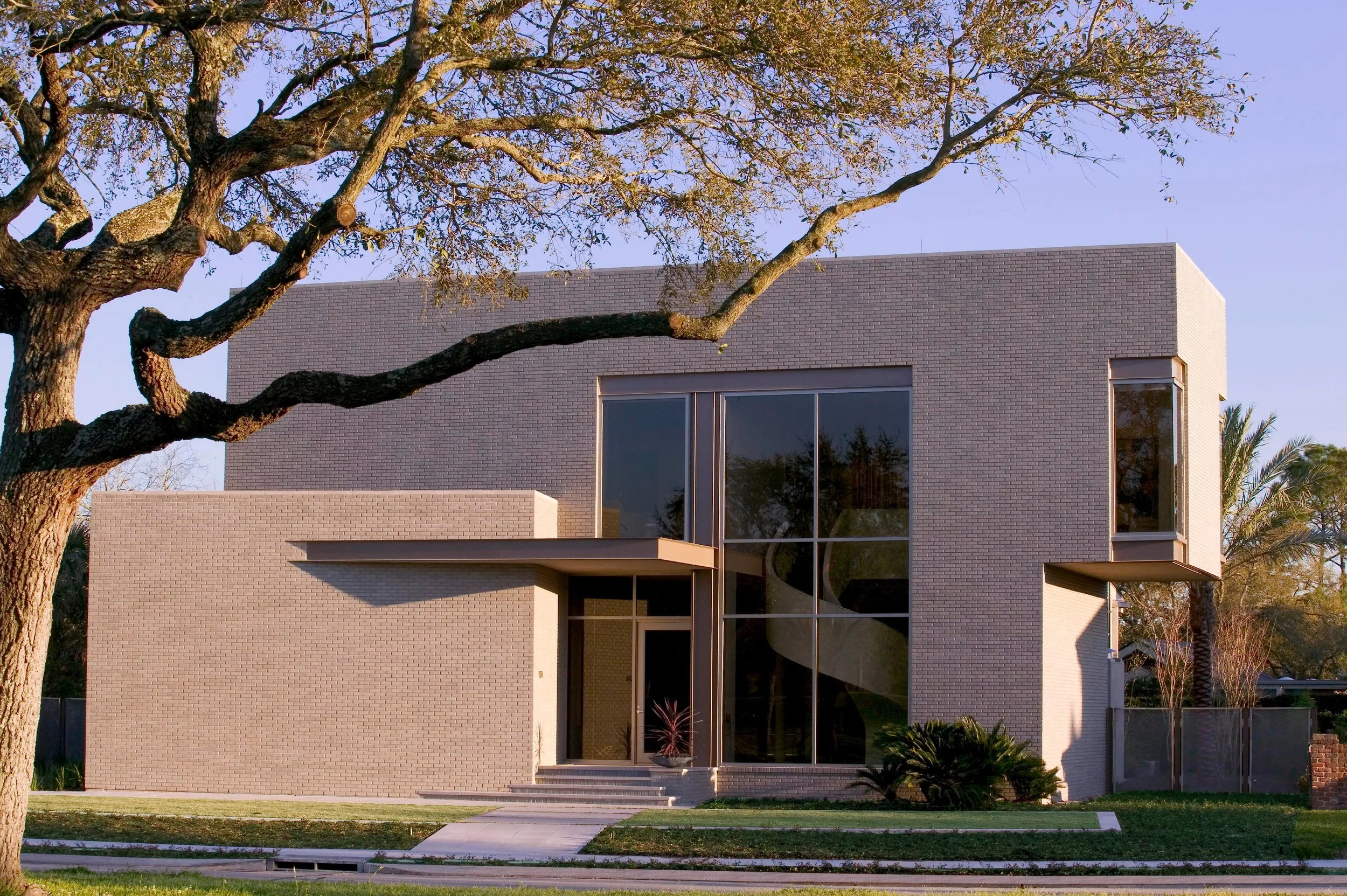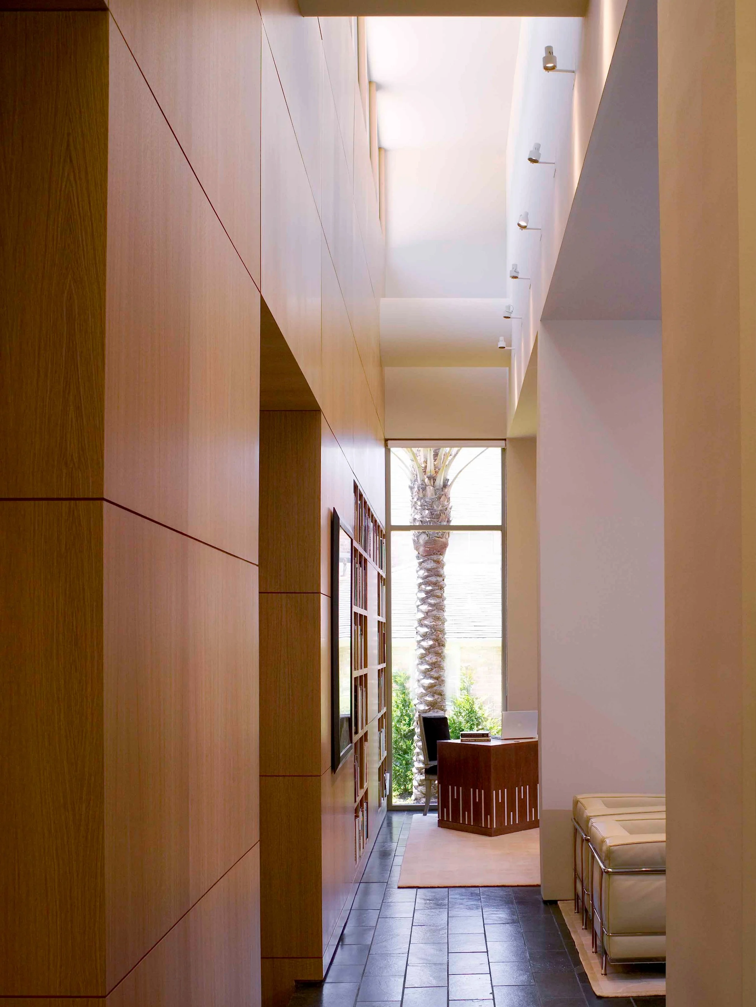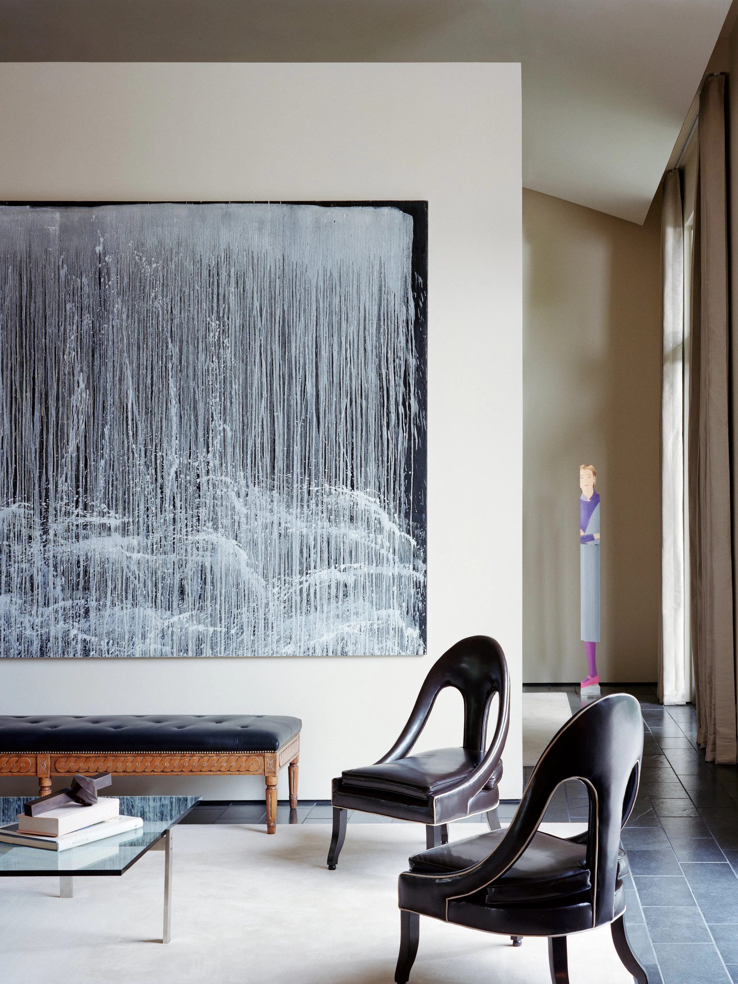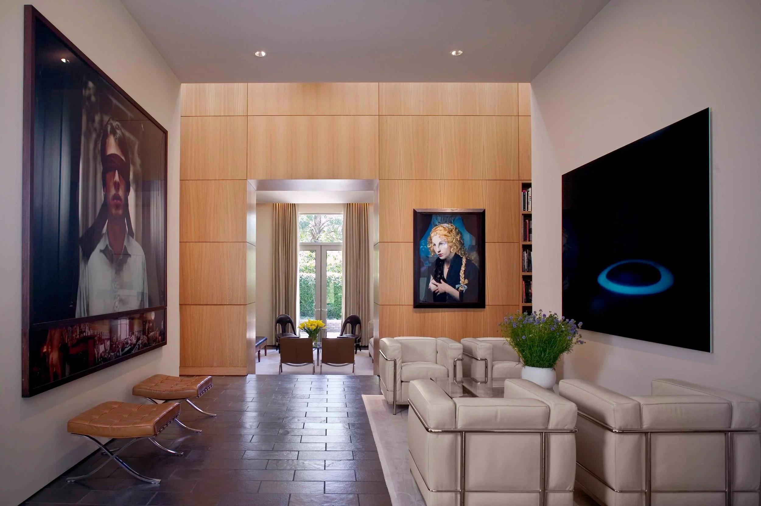 This minimalist silver-gray brick residence was designed to showcase a significant collection of contemporary paintings and photography while shielding them from excessive natural light. Inside, architectural features such as a serpentine staircase, arched ceiling, and warm oak spine soften the home’s rectilinear form, creating an inviting contrast to the cool white plaster walls and black slate floors. The interior design merges historical and modern furnishings, resulting in a home that celebrates both its art collection and everyday living.