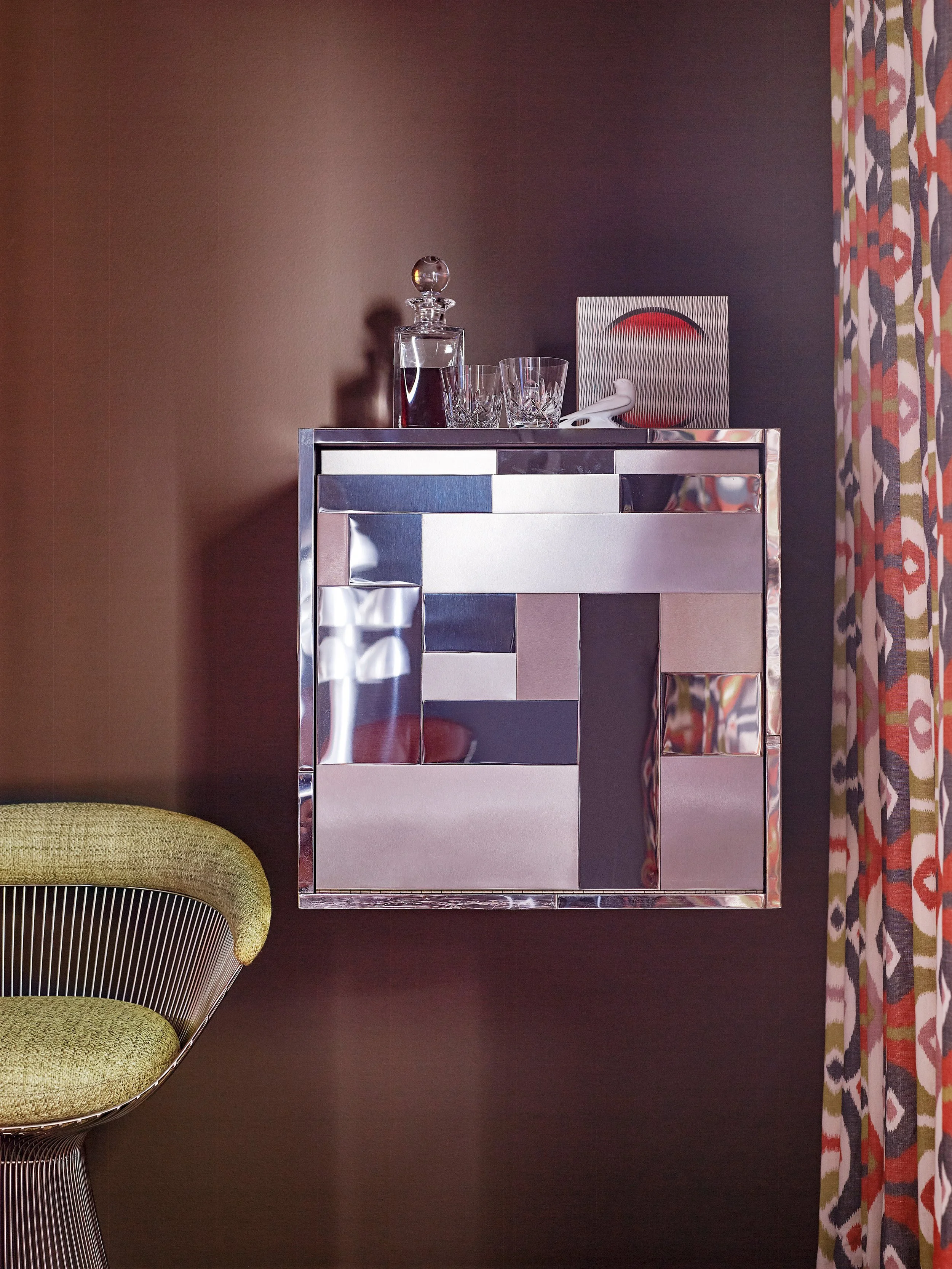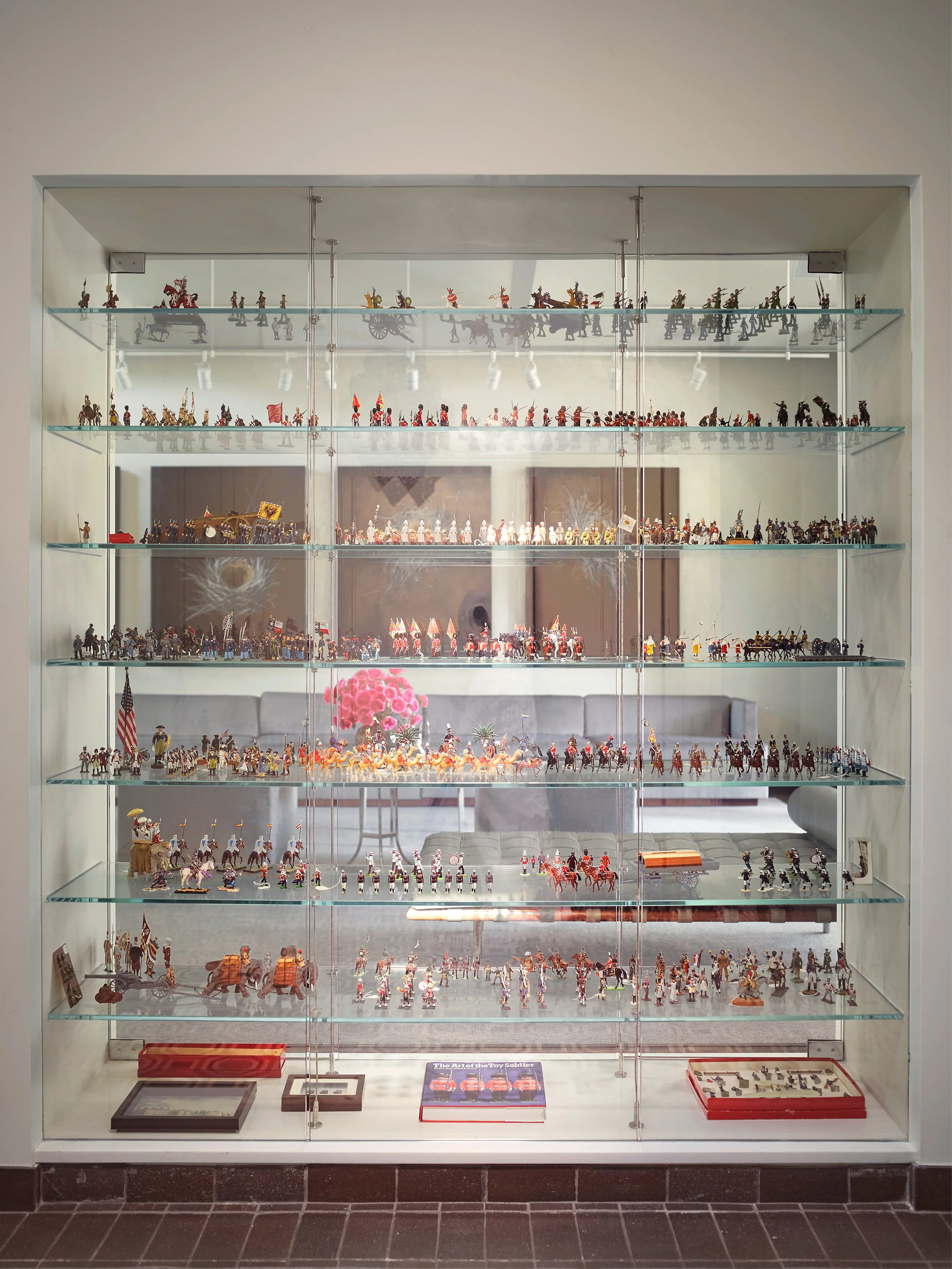 Interior walls were removed to create brighter, more expansive spaces for entertaining in this landmark 1980s Houston residence designed by noted architect Marvin Watson. Key updates include connecting the entry hall and living room through three wide openings—one featuring a glass case for antique toy soldiers—along with renovated kitchens, bathrooms, and fireplaces, and the conversion of the pool cabana into a den with a wet bar. The interiors, inspired by Halston’s minimalist yet luxurious aesthetic, showcase a refined gray palette accented with bold colors, custom Ledbetter designs, and iconic modernist furniture pieces.
